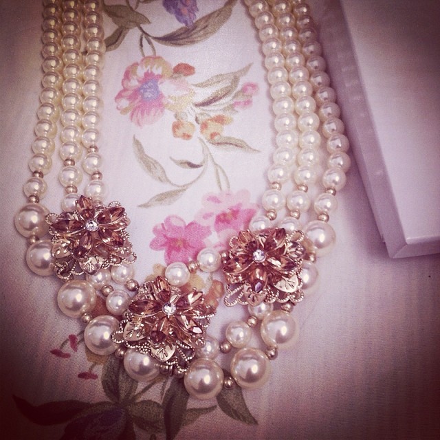 I am in for some retail therapy this week! Found this necklace which is a great find. I wish I wore it with a plain top because that would look better. I love that it was on sale. I wore the necklace today. Here in the picture, it is paired up with a purple floral top with collar: