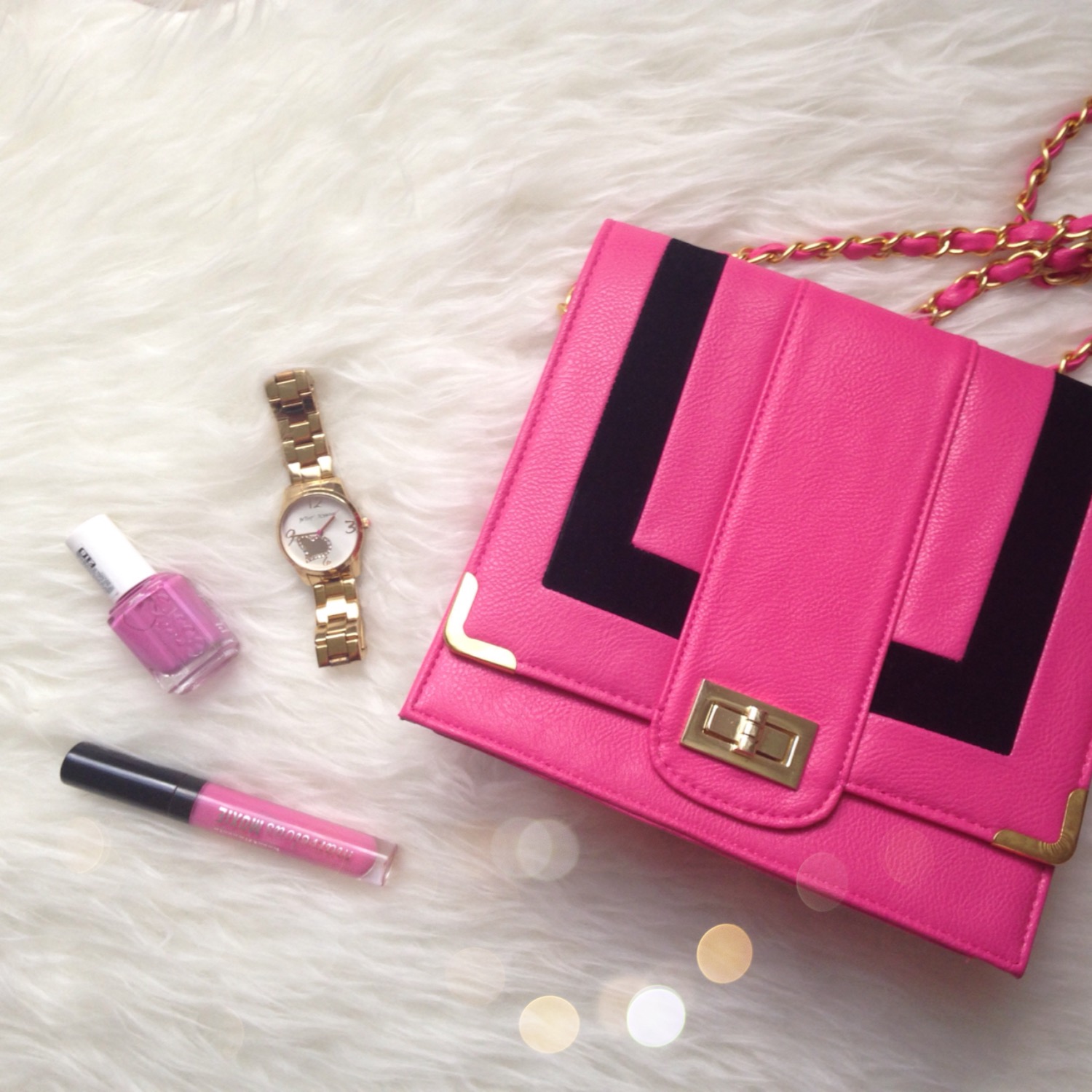 Essie nail polish in Madison Ave-Hue, Bareminerals Marvelous Moxie in Life of the Party, Betsey Johnson watch and pink purse gifted to me by my cousin Michelle last Christmas.